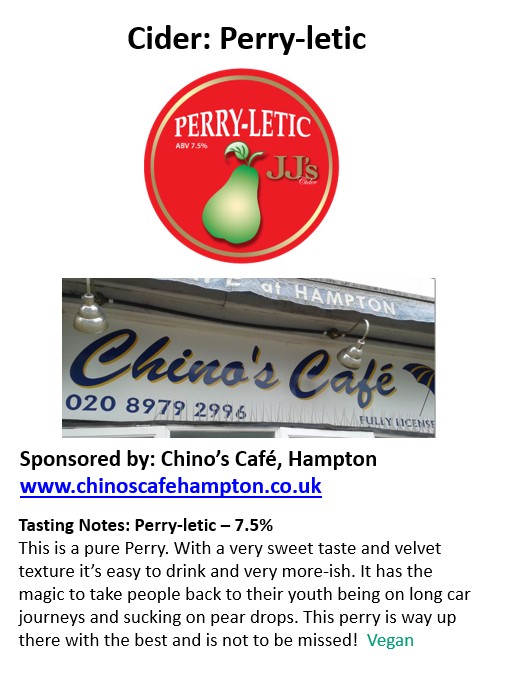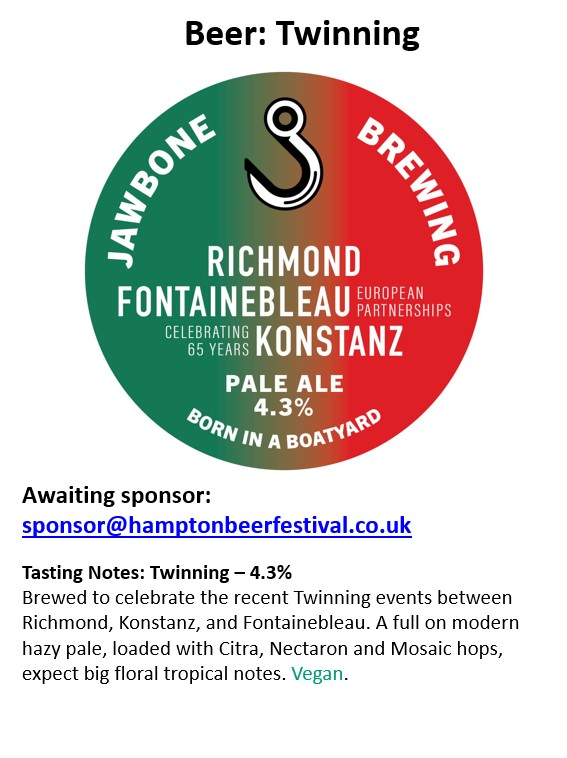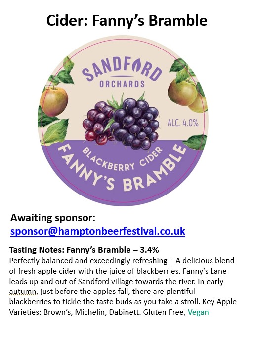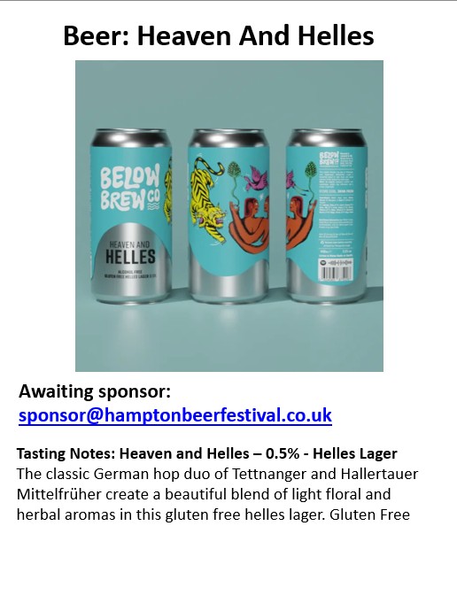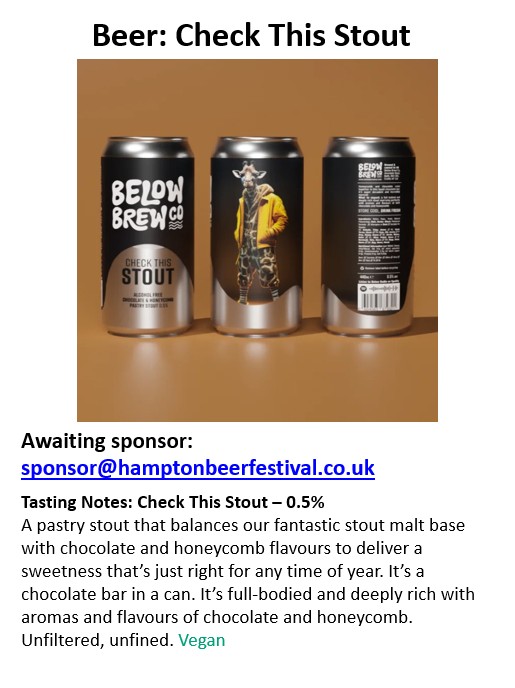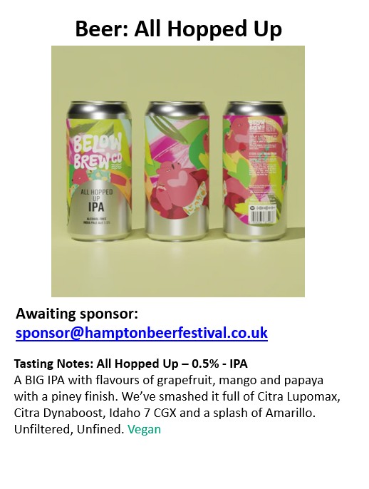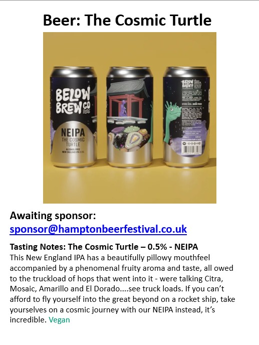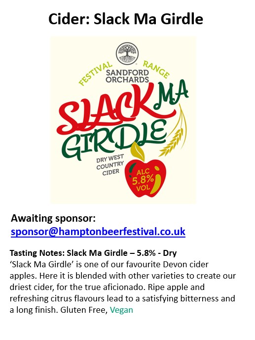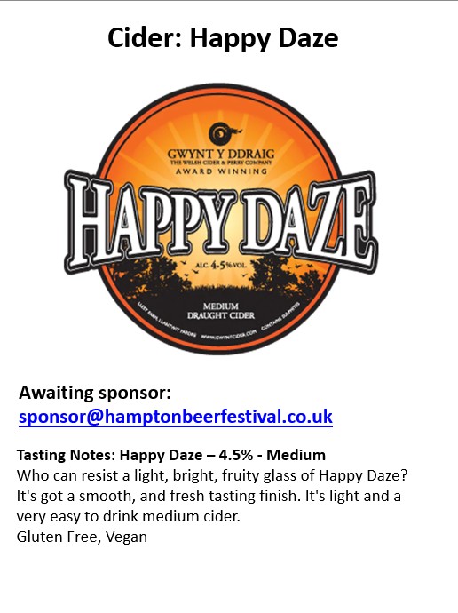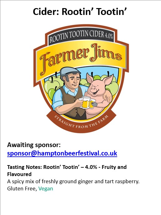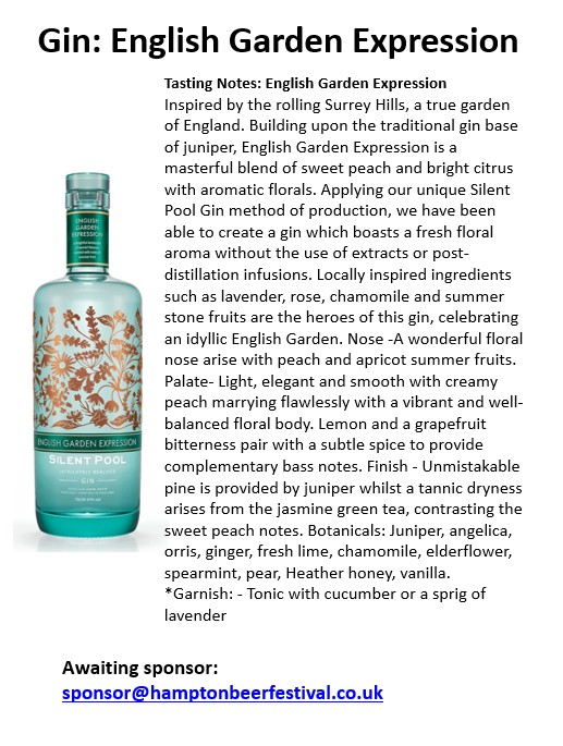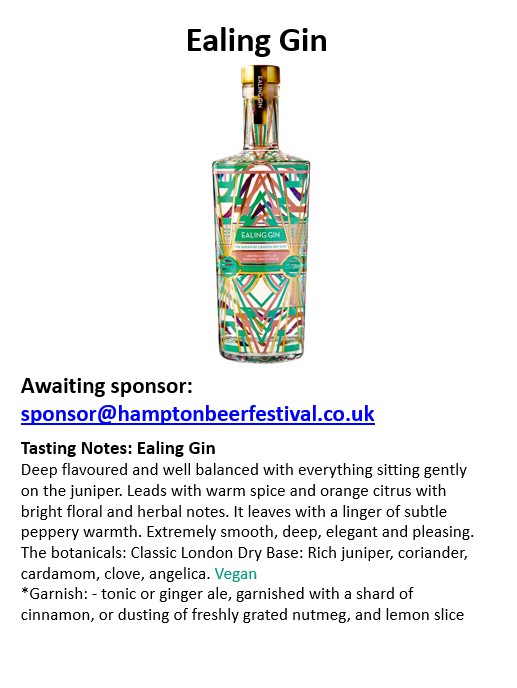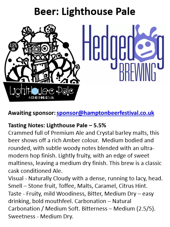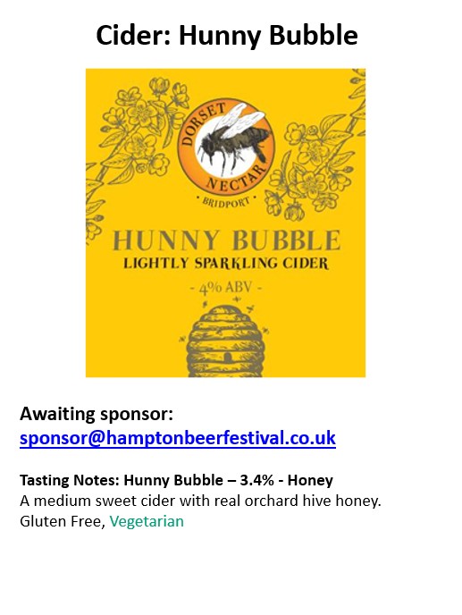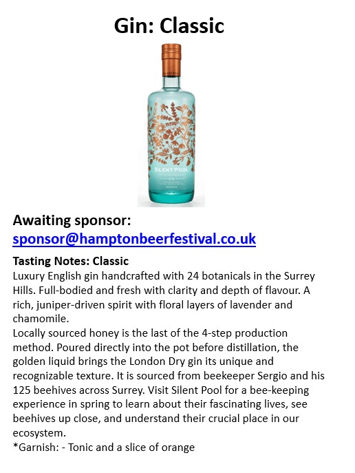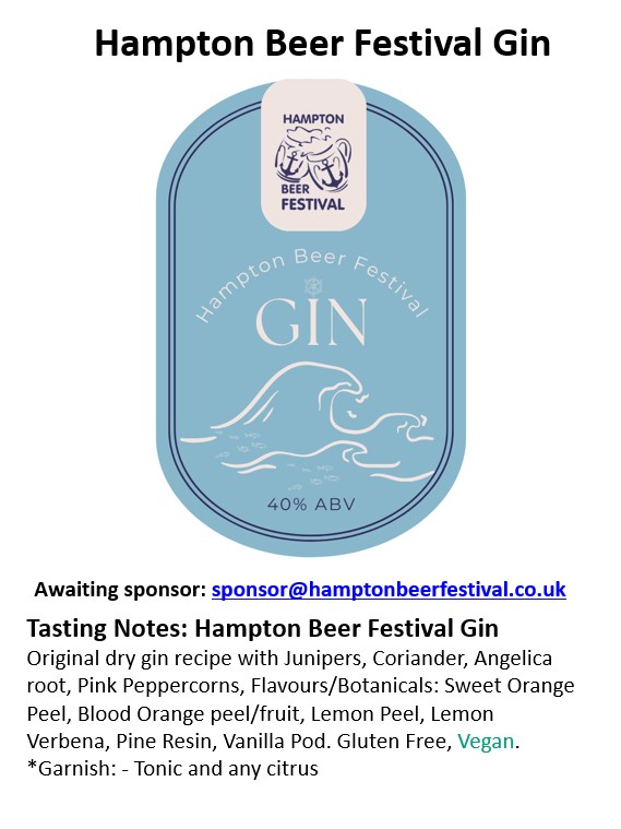 We're glad to be able offer a large selection of (mostly) local Beers, Ciders, and Gins at the Hampton Beer Festival. We have been donated some beers and have had others sponsored. If you would like to sponsor an aspect of the Beer Festival, contact us at sponsor@hamptonbeerfestival.co.uk